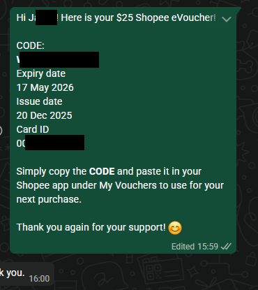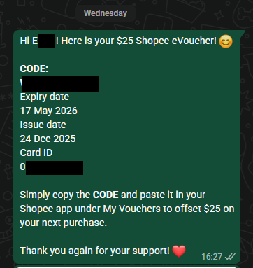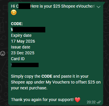 For a limited time, we are giving away $25 Shopee e-vouchers that you can use on the Shopee app right away to buy all your favourite stuffs! 🎉(Campaign may be paused or voucher value reduced to $10 once quota is hit – do grab fast now while you still see it!)