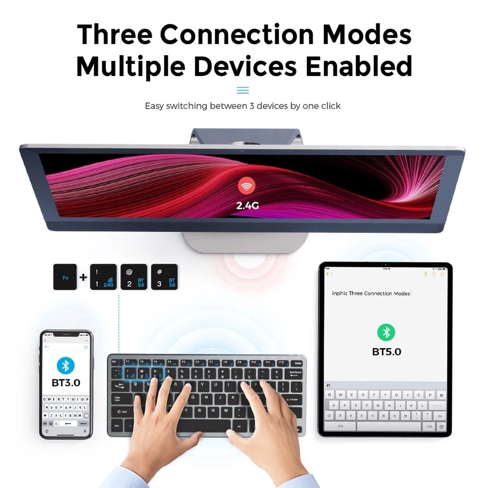 It supports three connection modes — Bluetooth 5.0, Bluetooth 3.0, and 2.4GHz wireless via USB dongle – allowing you to connect and switch between up to three devices instantly. Perfect for laptops, tablets, phones, smart TVs, and PCs across Windows, Mac OS, and Android. 🔄💻📱
